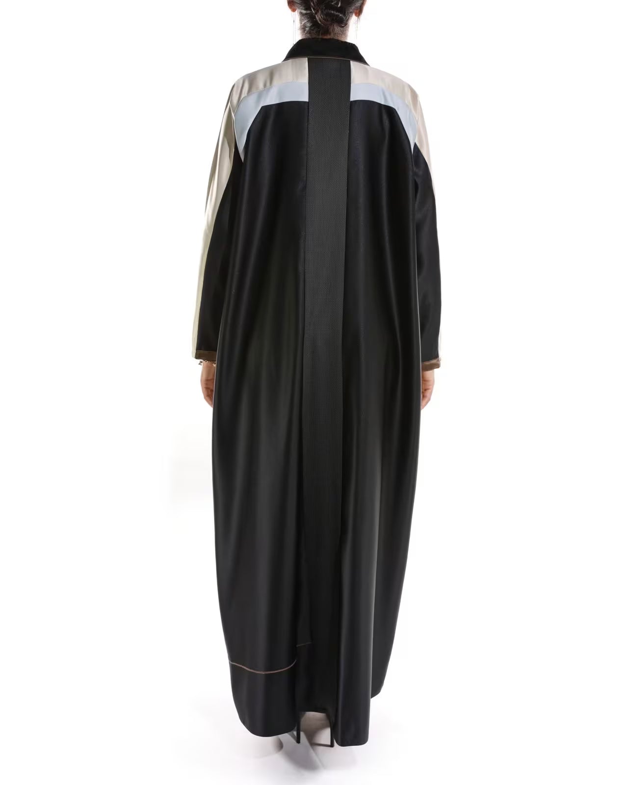 ارتقِ بخزانة ملابسك مع هذه العباءة الكلاسيكية العصرية. مصمّمة بقصّة A واسعة وطويلة، وتتميّز بياقة قميص أنيقة تضفي لمسة عصرية راقية. تضيف الأكمام الكلاسيكية المستقيمة ذات القصّات الهندسية، مع أساور بعرض 3 سم مزوّدة بغرز علوية، إحساسًا بالفخامة. كما تمنح القصّات الراجِلان الممتدة من خط العنق إلى الحافة، إضافة إلى الألواح ذات الخياطة العمودية في الخلف، انسيابيةً وأناقةً في الحركة.