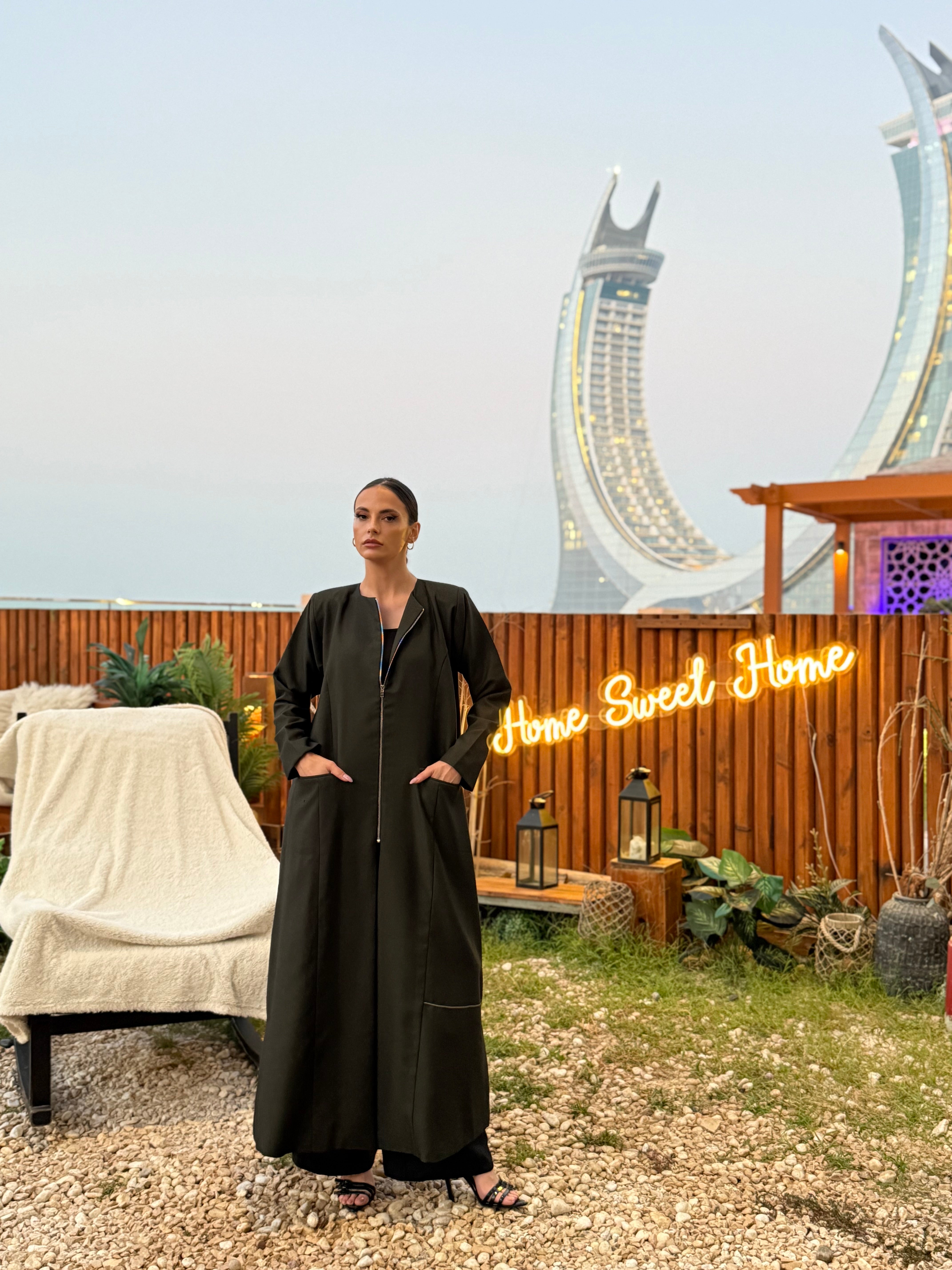 A winter zip-front blazer designed with side and back vents, structured padded shoulders, soft wool-crepe fabric, and practical pockets for a clean, tailored finish.